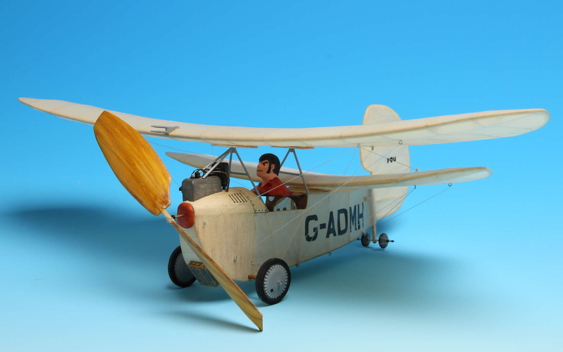 ゴム動力の模型飛行機にも様々なカテゴリがあり、その一つにピーナッツスケール機-peanut scale-があります。ピーナッツスケールは翼の幅を約33cm(13インチ)のサイズに統一した小さなゴム動力のスケールモデルです。 その魅力はスケールモデルとしての完成度とフライングモデルとしての性能を兼ね備えていることにあります。胴体や主翼の骨組みは主にバルサを用い、被覆は和紙を使います。 性能を良くするためにはできるだけ軽く作ることが重要です。普通は10~20gぐらいで出来ますが、10g以下で出来ればかなりの腕前です。 飛行時間は10~30秒。屋外では、上昇気流にのって見えなくなってしまうことさえあります。 ピーナッツスケール機の良いところは大きな製作スペースも必要なく、材料もごくわずかしか使いません。